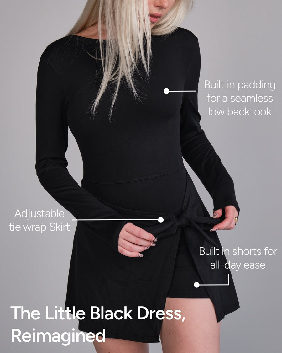 Effortlessly chic and endlessly comfy. Designed with a soft sculpting stretch, built in shorts, a flattering tie waist, and a sleek low back silhouette. She’s your new go-anywhere, do-anything essential. From studio to street, this wrap-inspired mini brings that clean, confident Lucky Honey energy every day.