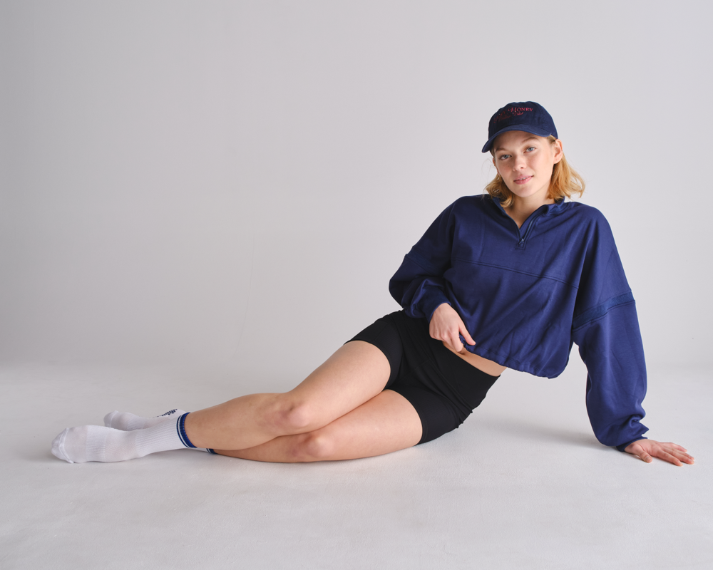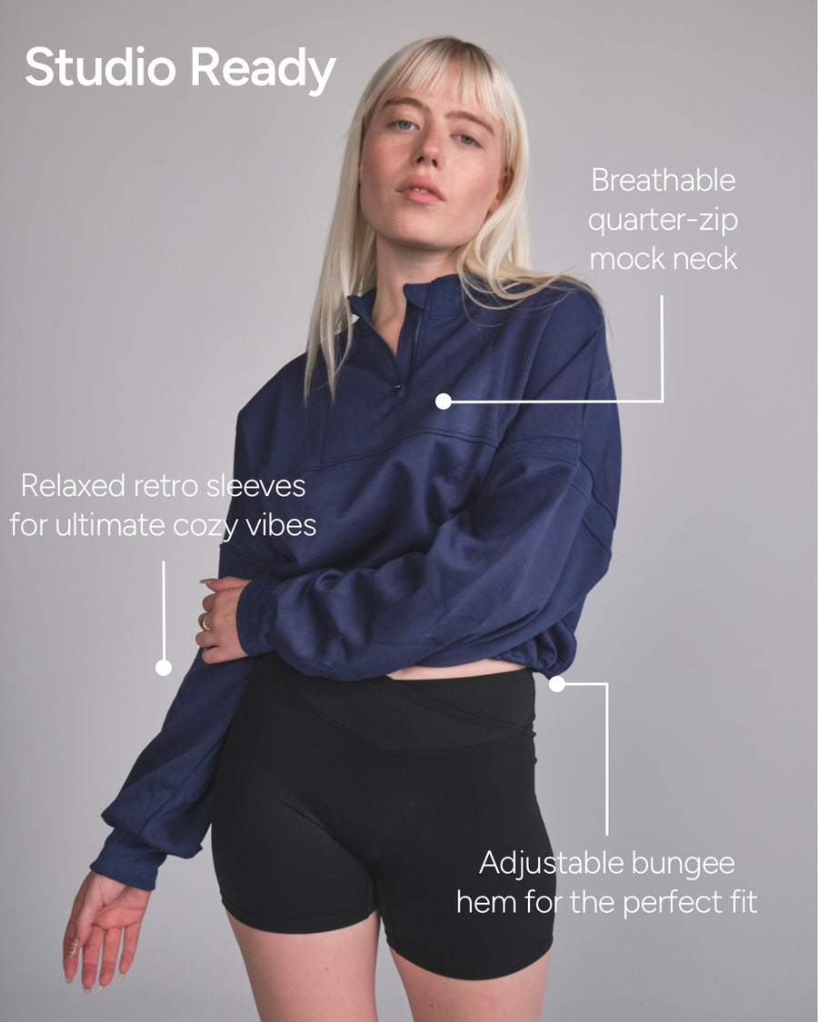 Meet The Studio Sweatshirt, your new cozy-meets-cool essential. Designed with a cropped fit, adjustable bungee hem, and soft structured feel, it’s perfect for warm-ups, cooldowns, and coffee runs. Effortless, elevated, and made for movement, this quarter zip pullover brings that signature Lucky Honey ease everywhere you go.