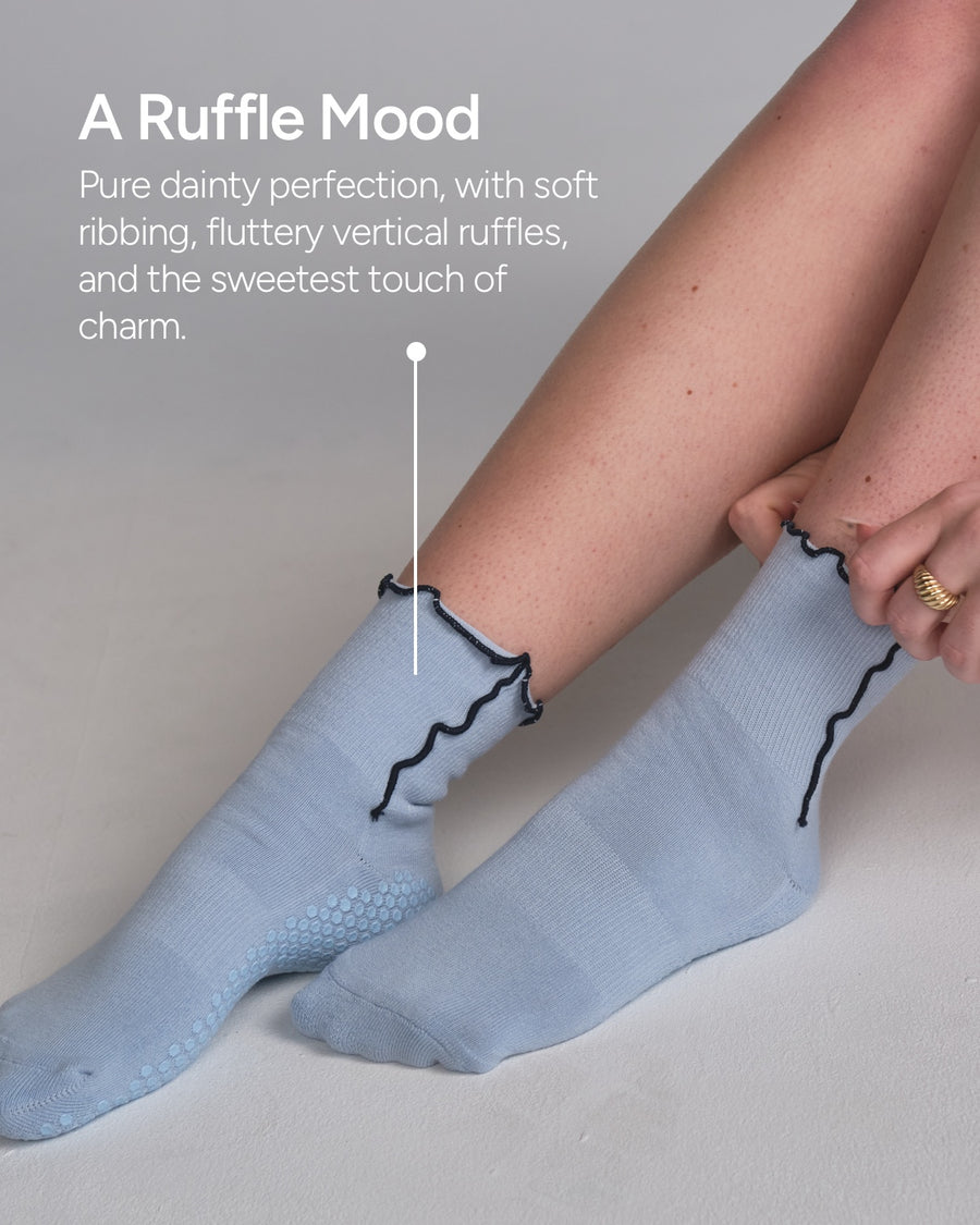 The sweetest sock you ever did see. The Ribbed Ruffle Grip Sock brings all the dainty charm with its soft ribbed texture and fluttery vertical lettuce-edge ruffle at the ankle. Finished with our signature honeycomb grips, it’s the perfect blend of cute, comfy, and totally ballet-core.
