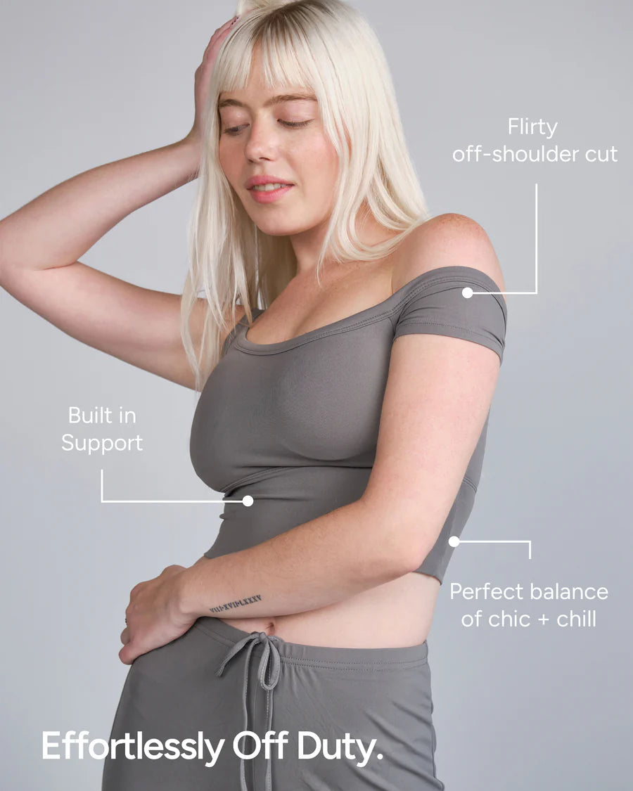 Soft, stretchy, and effortlessly flattering. This off-shoulder crop top hugs your body with a smooth, second-skin feel. Designed for lounging or layering, it features a modern neckline and minimal silhouette that pairs perfectly with your favorite lounge pants or jeans for an elevated off-duty look.