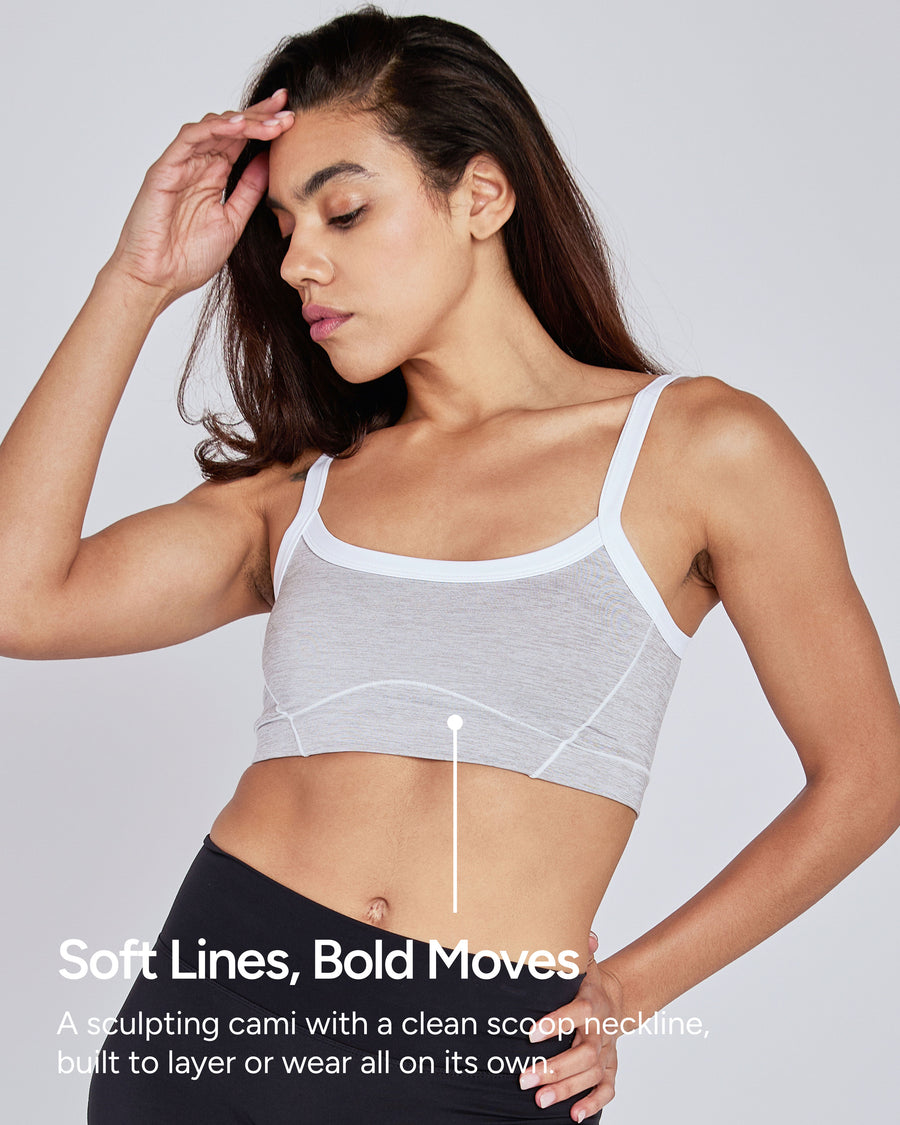 Retro lines, modern support. The Trace Cropped Cami is a sport-inspired bra top with contrast binding and a sleek scoop neckline. Its supportive band and soft, sculpting fabric make it ideal for both movement and rest.